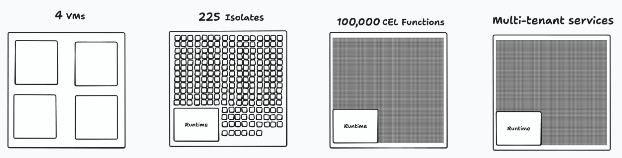 What if we knew that agent wanted to write access controls? We could give them a more restricted language like CEL [5]. CEL only needs a few kilobytes of overhead per function. That’s close to 4 orders of magnitude more efficient than VMs. And we can still keep going.