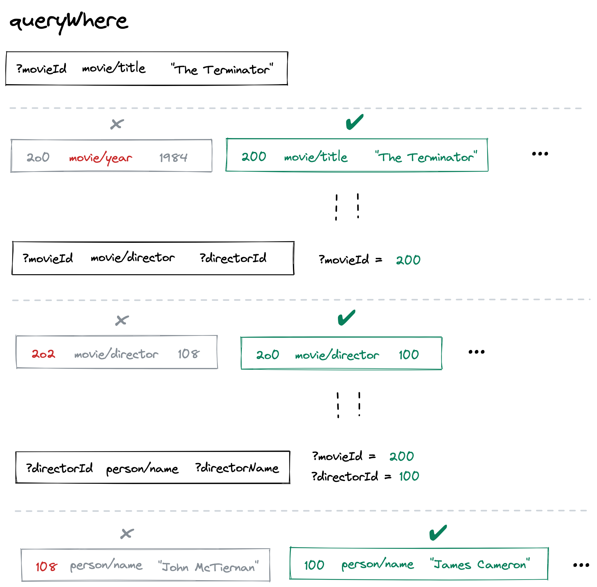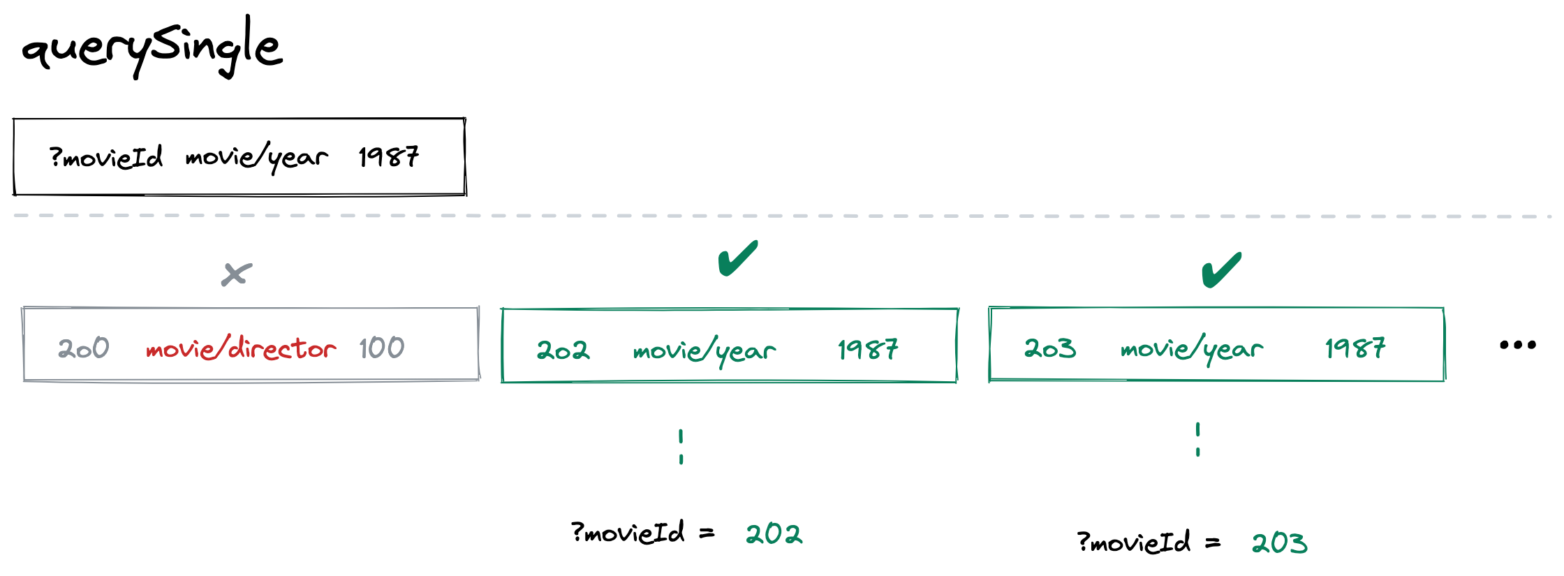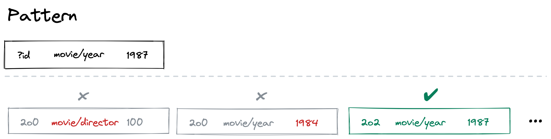 Our query engine runs through triple after triple. Since ?id can be anything, this matches every triple. But, the attribute movie/year and the value 1987 filter us down to just the triples we care about: