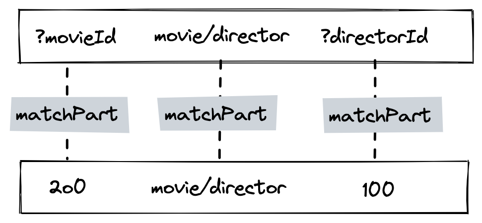 Here we tell the query engine to match three patterns. The first pattern produces a list of successful triples. For each successful triple, we search again with the second pattern, and so on. Notice how the ?movieId and ?directorId are repeated; this tells our query engine that for a successful match, those values would need to be the same across our different searches.